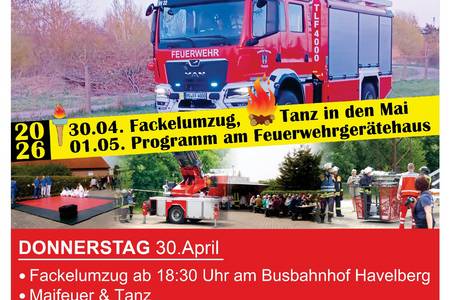 - Fackelumzug am 30. April, gestartet wird 18.30 Uhr ab Wasserturm, der Fackelumzug führt über Birkenweg, Mühlenstraße, Breite Straße, Löhestraße, Löhestraße, Neustädter Straße, Gewerbegebiet, am Löschteich vorbei zum Gerätehaus der Freiwilligen Feuerwehr